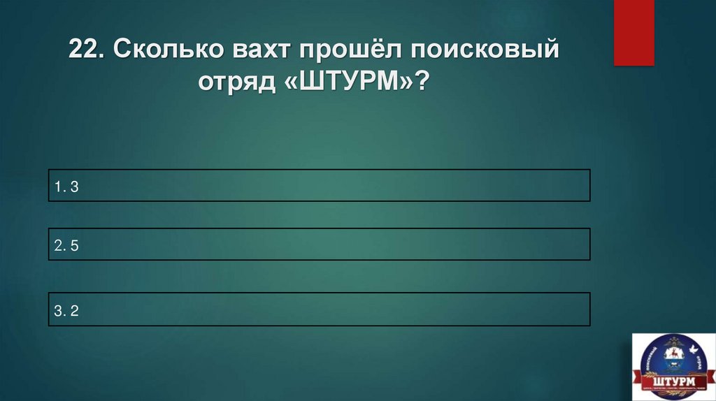 22. Сколько вахт прошёл поисковыйотряд «ШТУРМ»?
