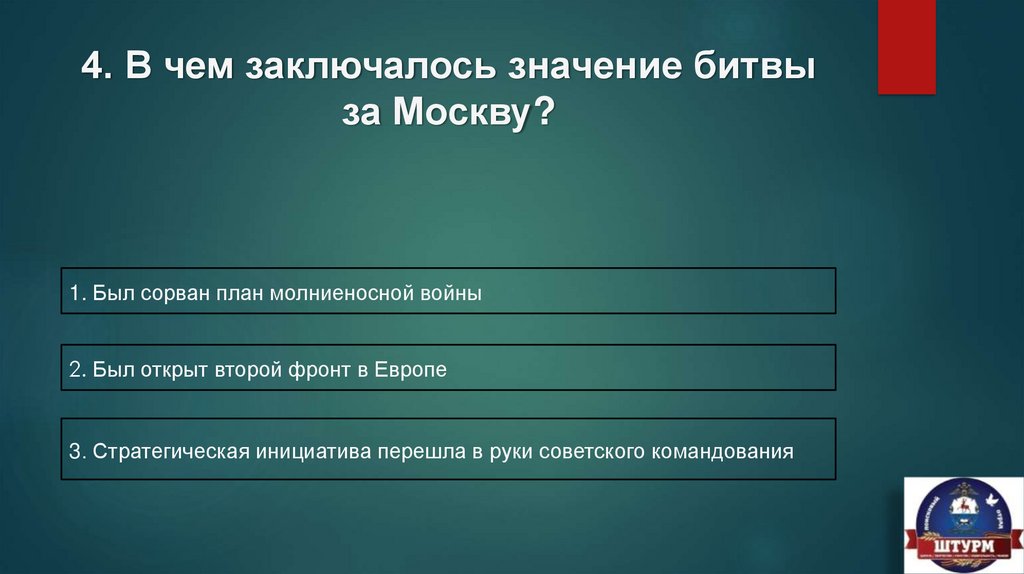 4. В чем заключалось значение битвыза Москву?