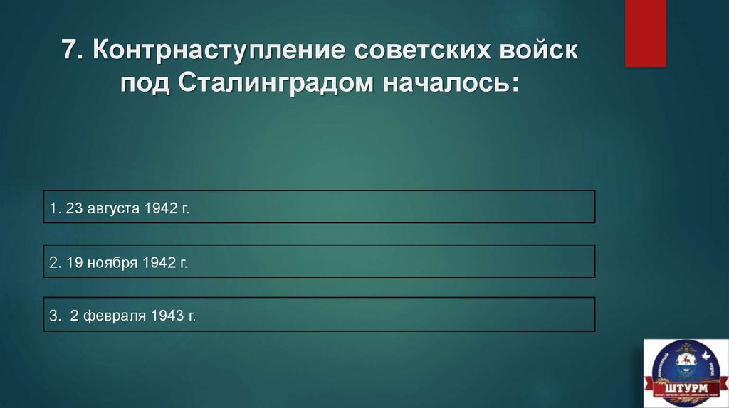 7. Контрнаступление советских войскпод Сталинградом началось: