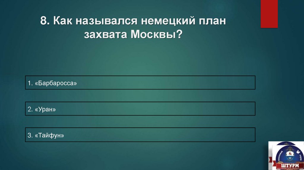 8. Как назывался немецкий планзахвата Москвы?