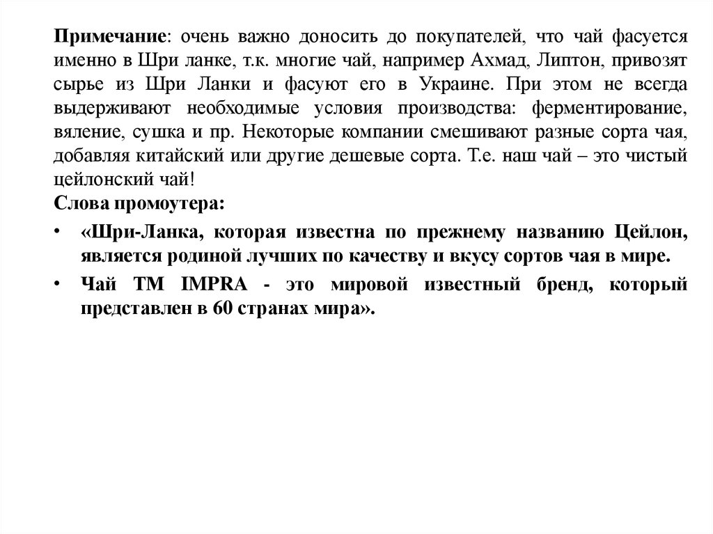 Примечание: очень важно доносить до покупателей, что чай фасуетсяименно в Шри ланке, т.к. многие чай, например Ахмад, Липтон, привозят