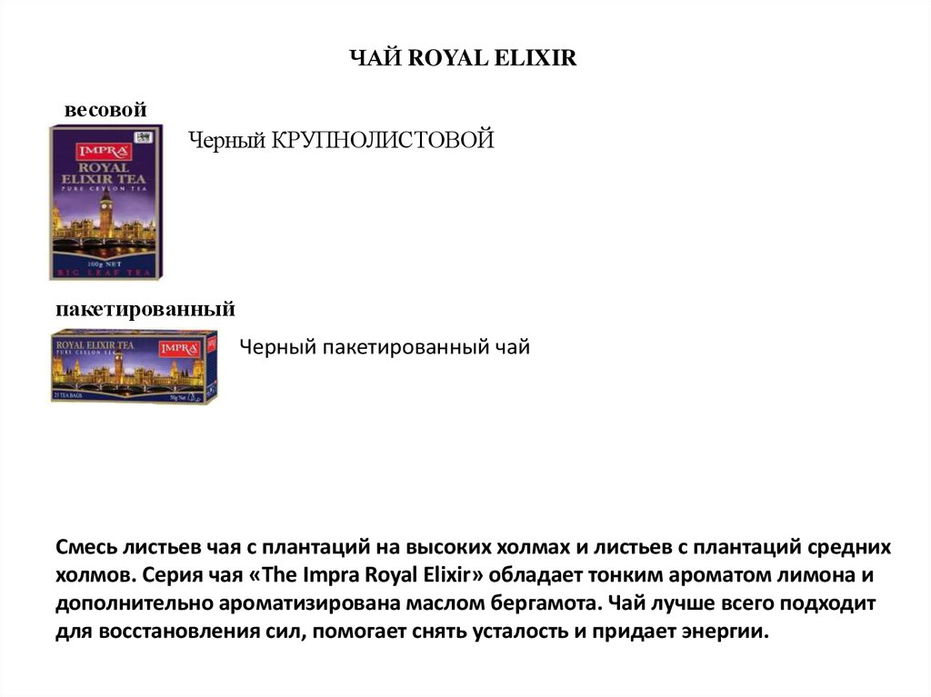 холмов. Серия чая «The Impra Royal Elixir» обладает тонким ароматом лимона и