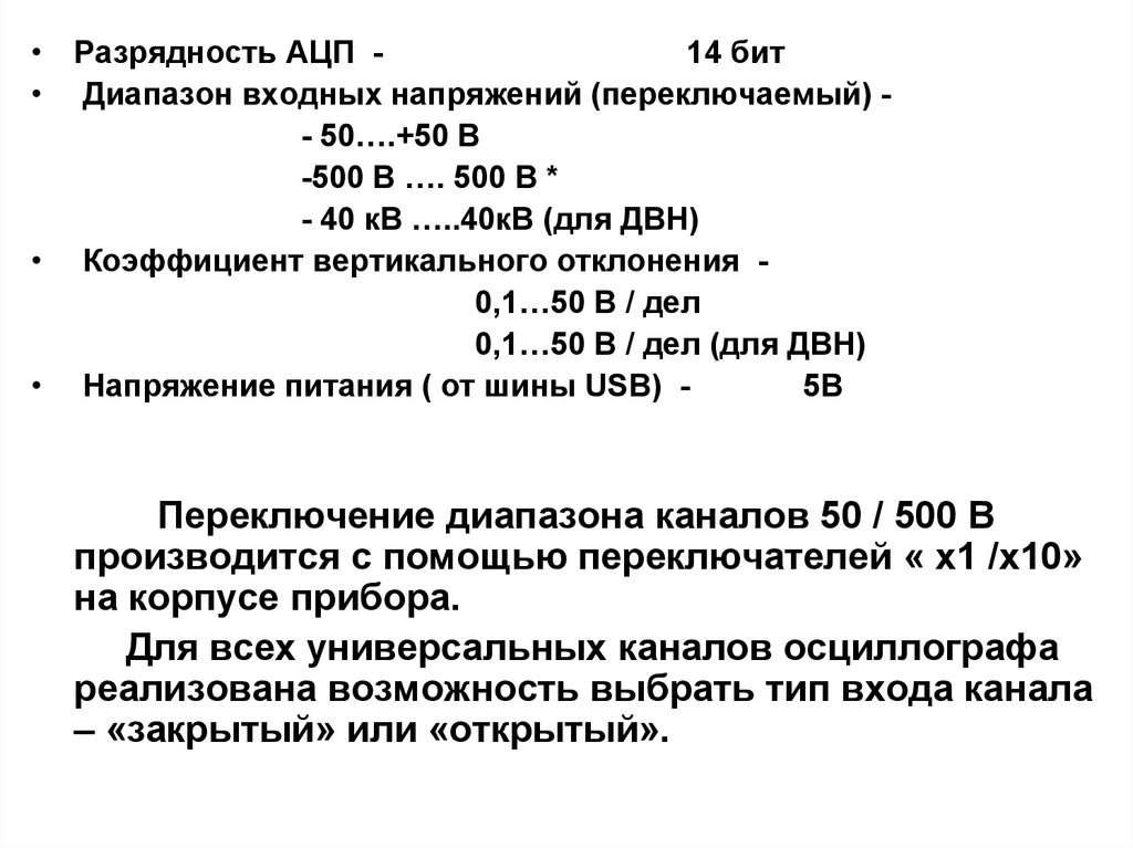 • Разрядность АЦП 14 бит• Диапазон входных напряжений (переключаемый) - 50….+50 В