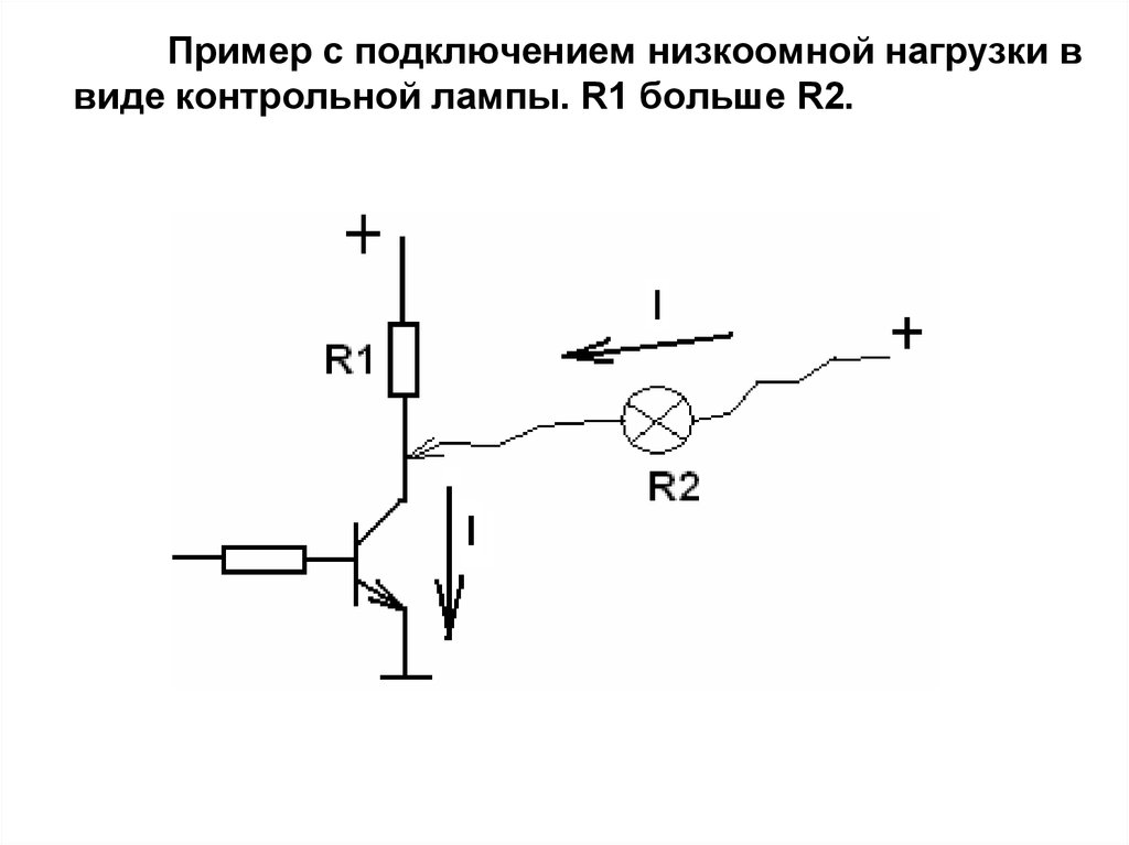 Пример с подключением низкоомной нагрузки ввиде контрольной лампы. R1 больше R2.