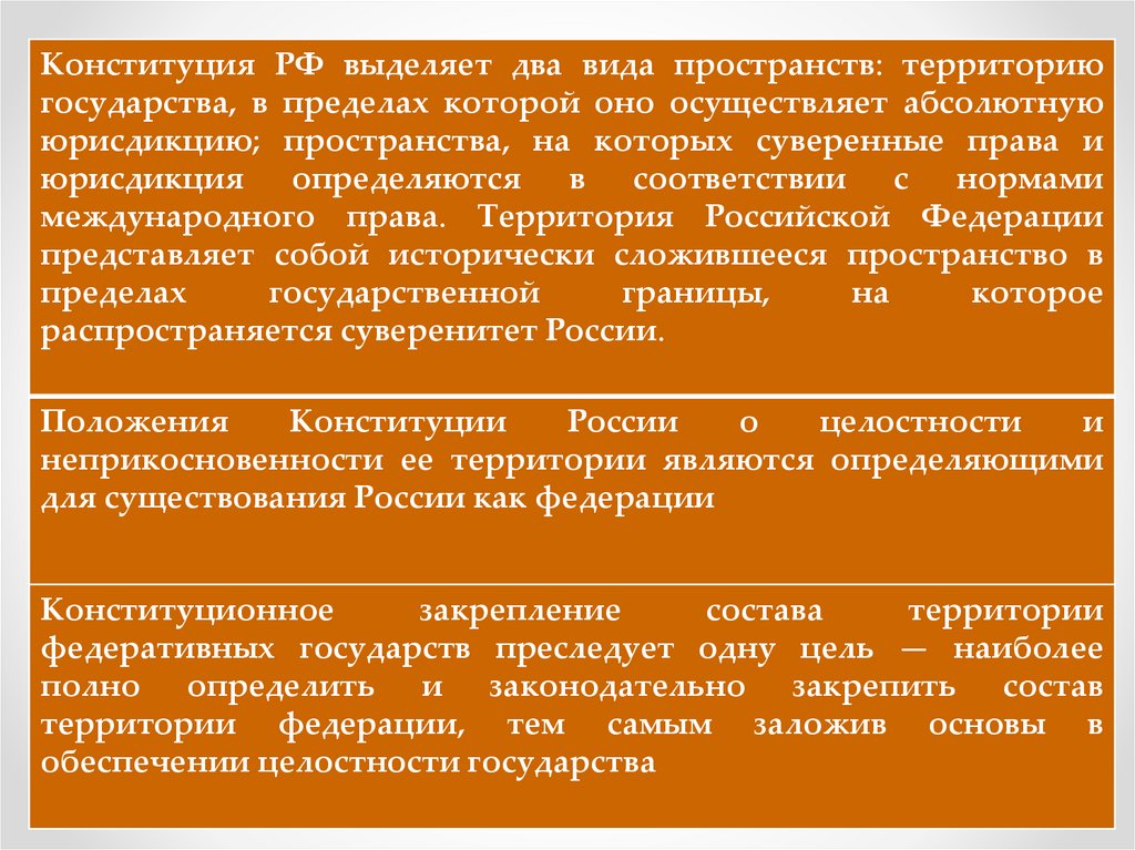 Конституция РФ выделяет два вида пространств: территориюгосударства, в пределах которой оно осуществляет абсолютную