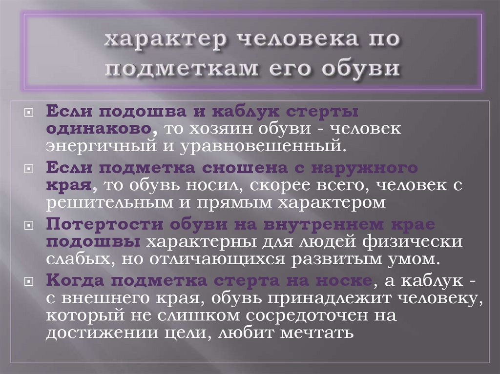 Если подошва и каблук стертыодинаково, то хозяин обуви - человек
