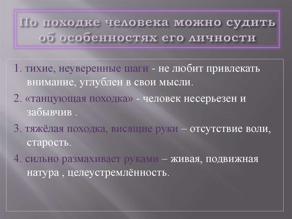 1. тихие, неуверенные шаги - не любит привлекатьвнимание, углублен в свои мысли.