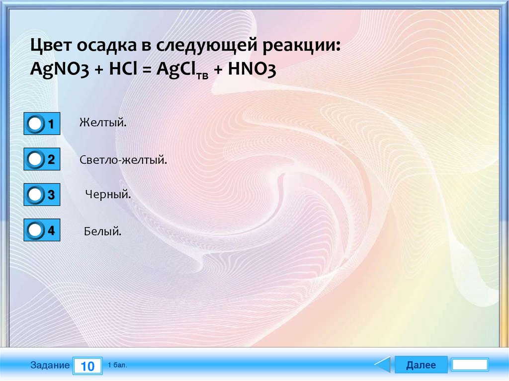 Цвет осадка в следующей реакции:AgNO3 + HCl = AgClтв + HNO3