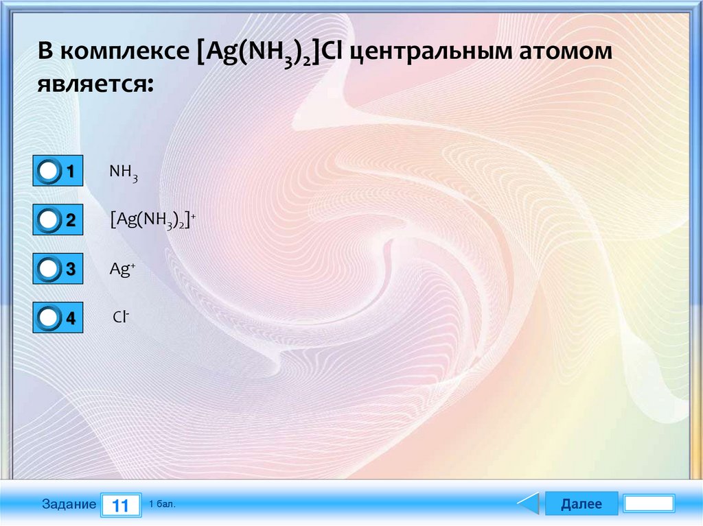 В комплексе [Ag(NH3)2]Cl центральным атомомявляется: