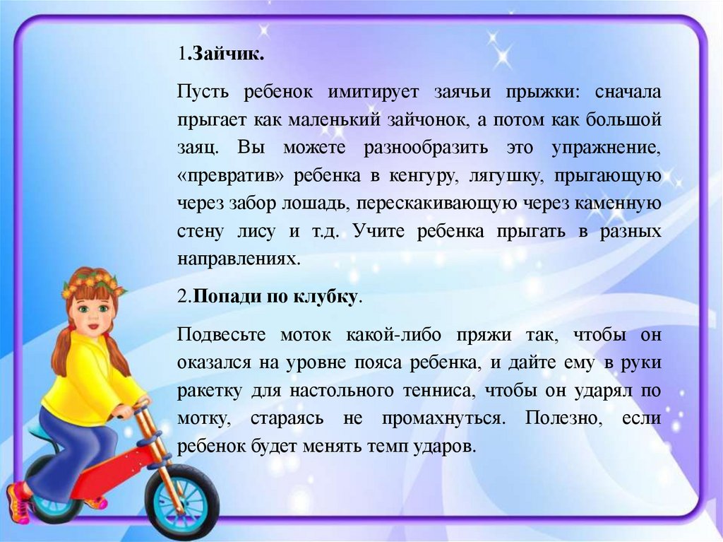1.Зайчик.Пусть ребенок имитирует заячьи прыжки: сначала