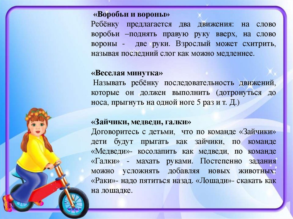 «Воробьи и вороны»Ребёнку предлагается два движения: на слово