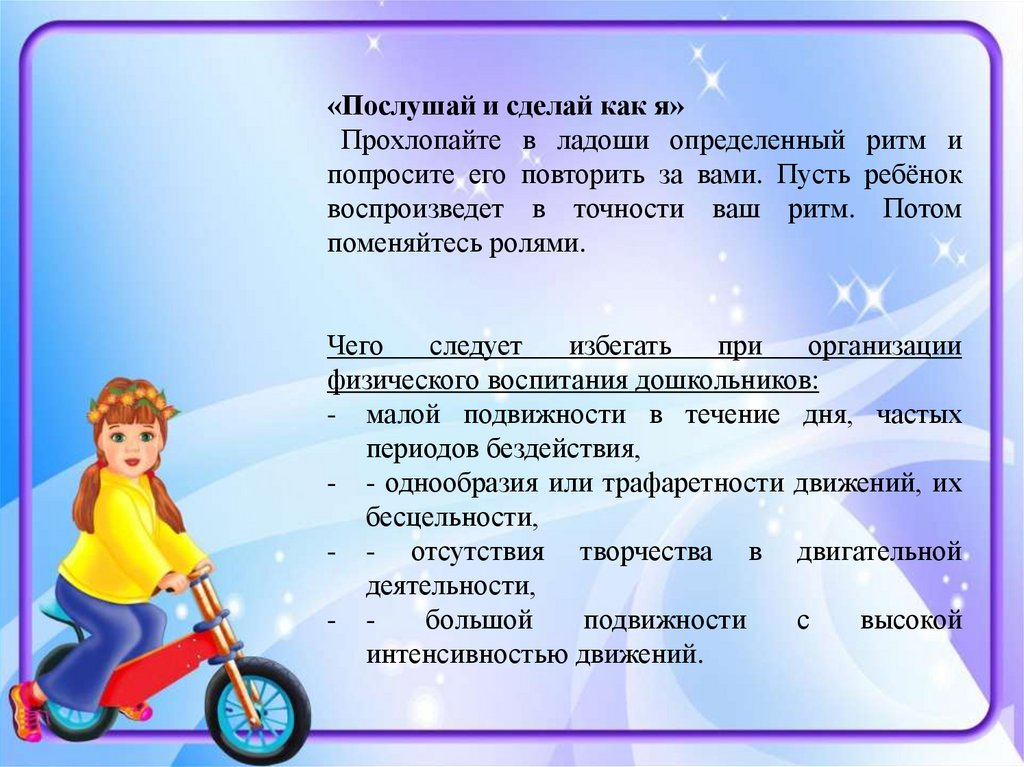 «Послушай и сделай как я»Прохлопайте в ладоши определенный ритм и