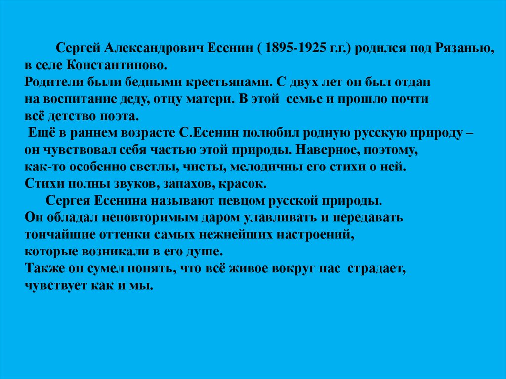Ещё в раннем возрасте С.Есенин полюбил родную русскую природу –