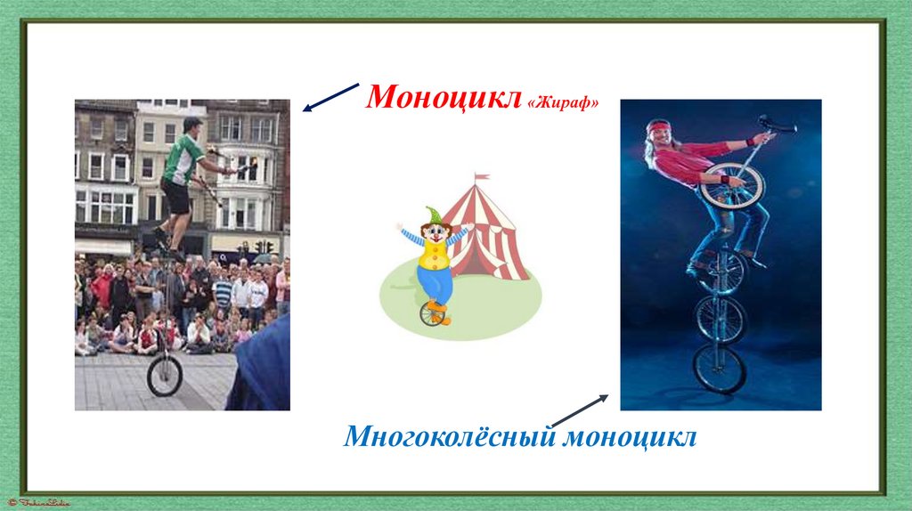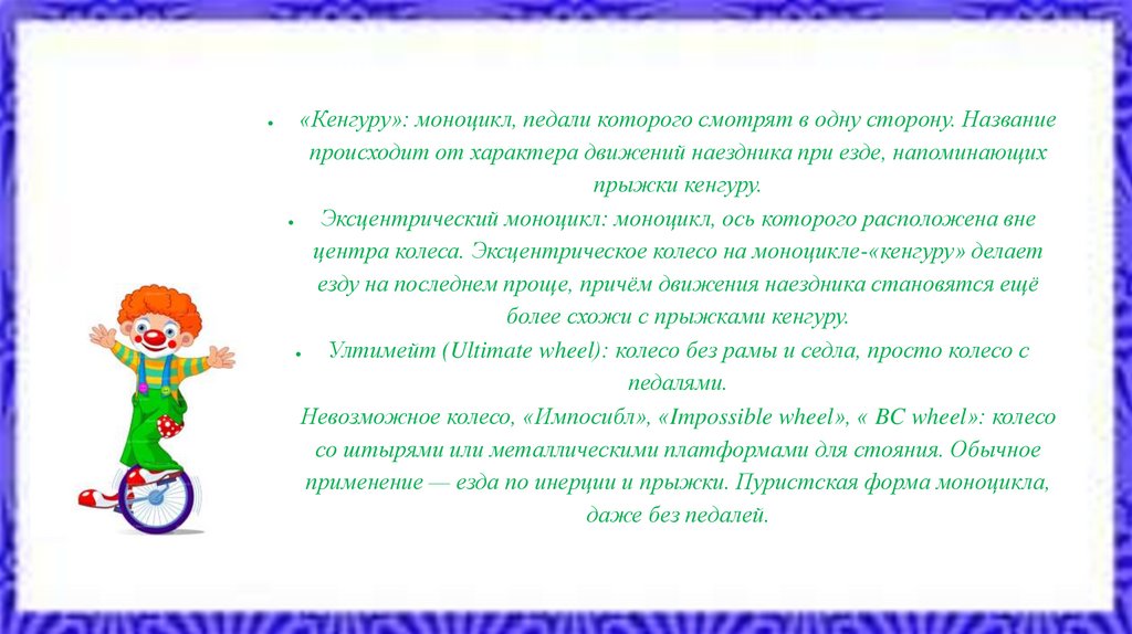 «Кенгуру»: моноцикл, педали которого смотрят в одну сторону. Названиепроисходит от характера движений наездника при езде, напоминающих