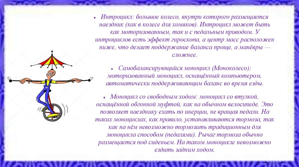 Интроцикл: большое колесо, внутри которого размещаетсянаездник (как в колесе для хомяков). Интроцикл может быть