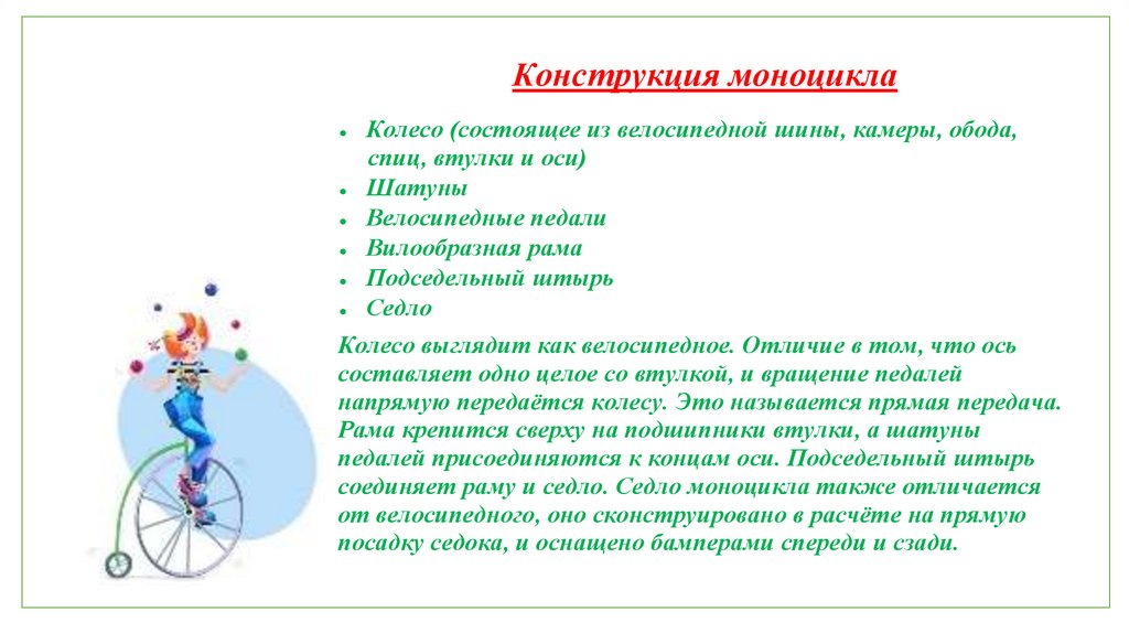 Конструкция моноциклаКолесо (состоящее из велосипедной шины, камеры, обода,
