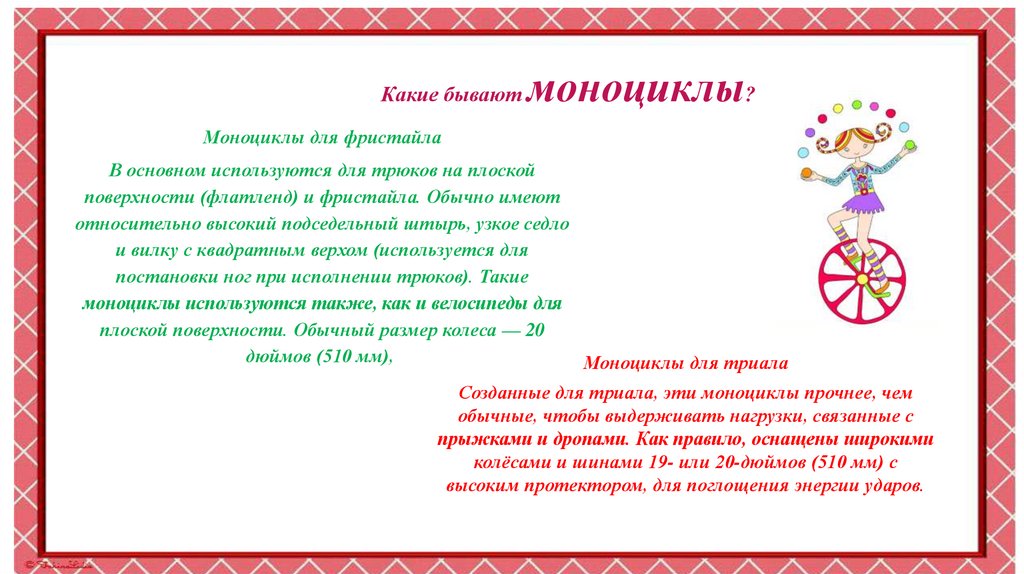 применение — езда по инерции и прыжки. Пуристская форма моноцикла,