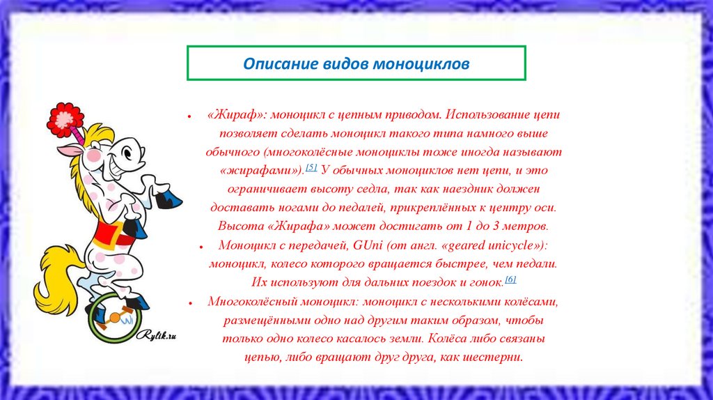 «жирафами»).[5] У обычных моноциклов нет цепи, и это