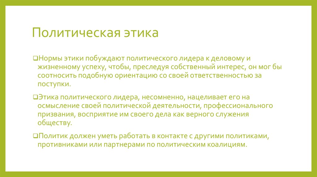 Политическая этикаНормы этики побуждают политического лидера к деловому и