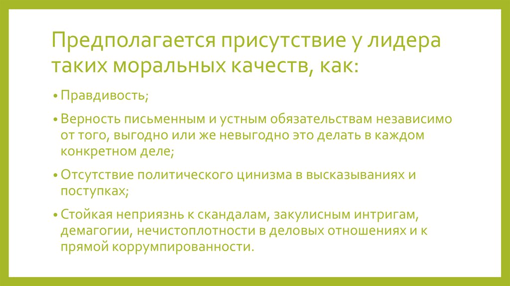Предполагается присутствие у лидератаких моральных качеств, как: