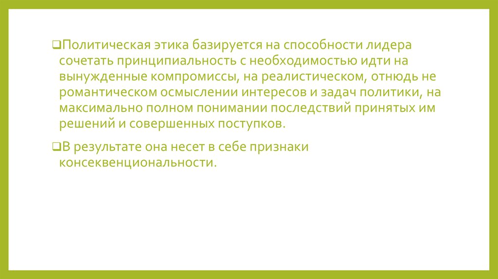 Политическая этика базируется на способности лидерасочетать принципиальность с необходимостью идти на