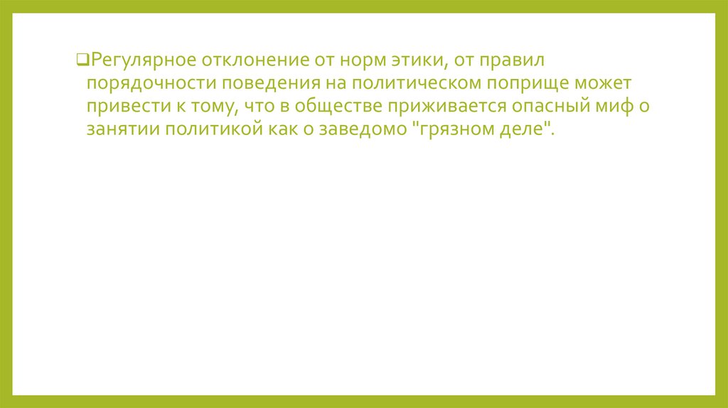 Регулярное отклонение от норм этики, от правилпорядочности поведения на политическом поприще может