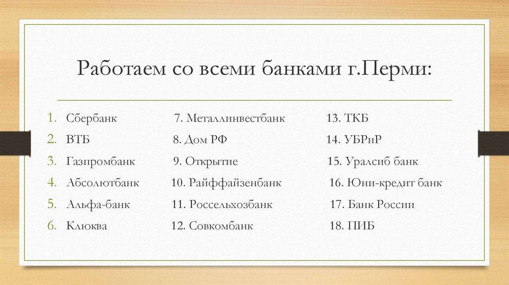 Работаем со всеми банками г.Перми:1.