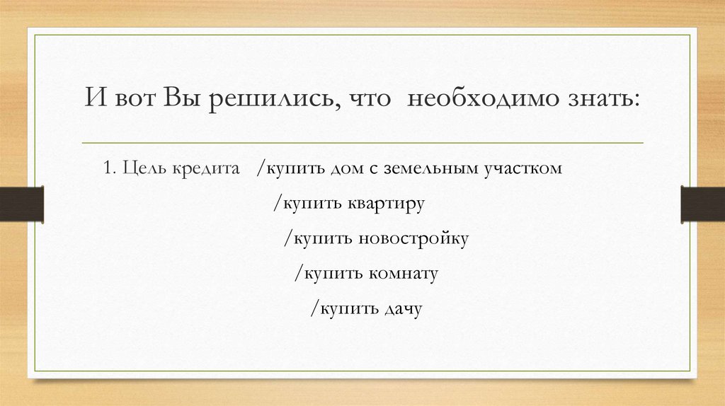 И вот Вы решились, что необходимо знать:1. Цель кредита /купить дом с земельным участком