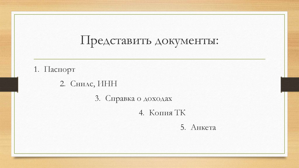 Представить документы:1. Паспорт