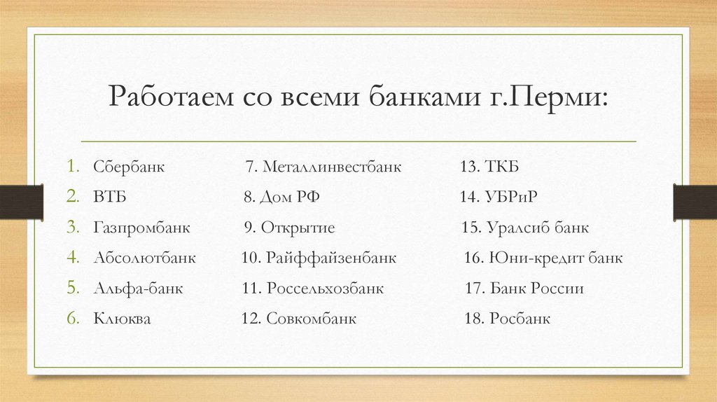 Работаем со всеми банками г.Перми:1.