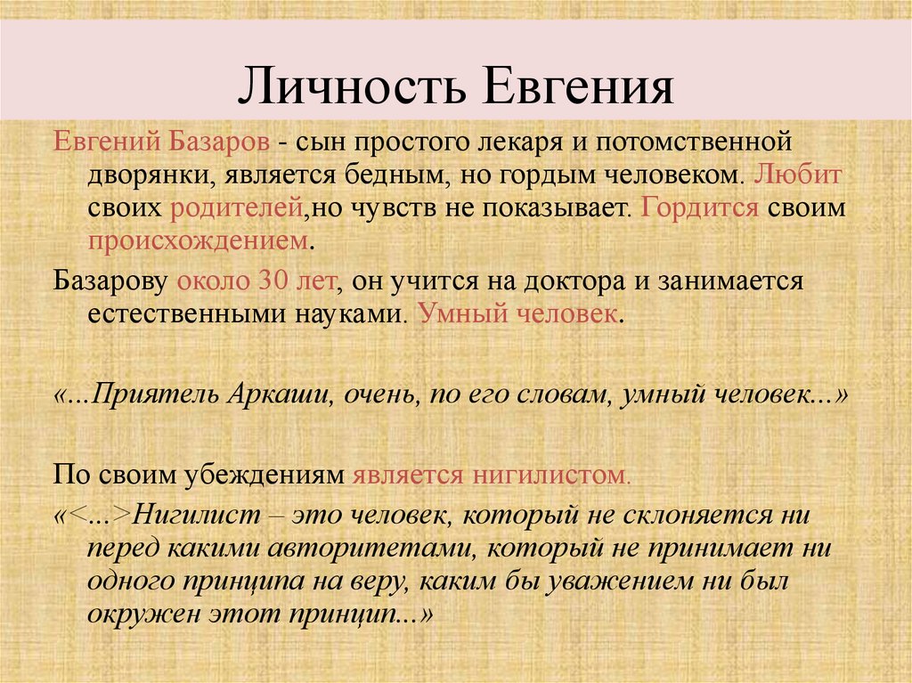 Личность ЕвгенияЕвгений Базаров - сын простого лекаря и потомственной