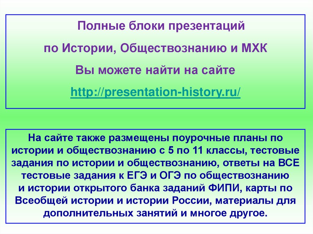 Полные блоки презентацийпо Истории, Обществознанию и МХК