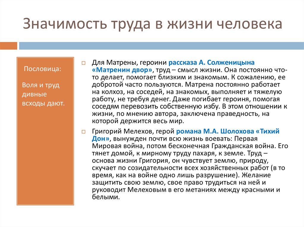 «Матренин двор», труд – смысл жизни. Она постоянно чтото делает, помогает близким и знакомым. К сожалению, ее