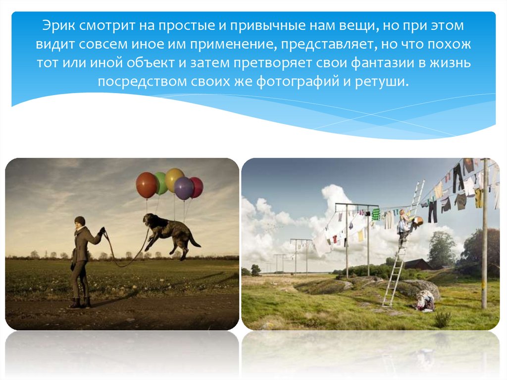 Эрик смотрит на простые и привычные нам вещи, но при этомвидит совсем иное им применение, представляет, но что похож