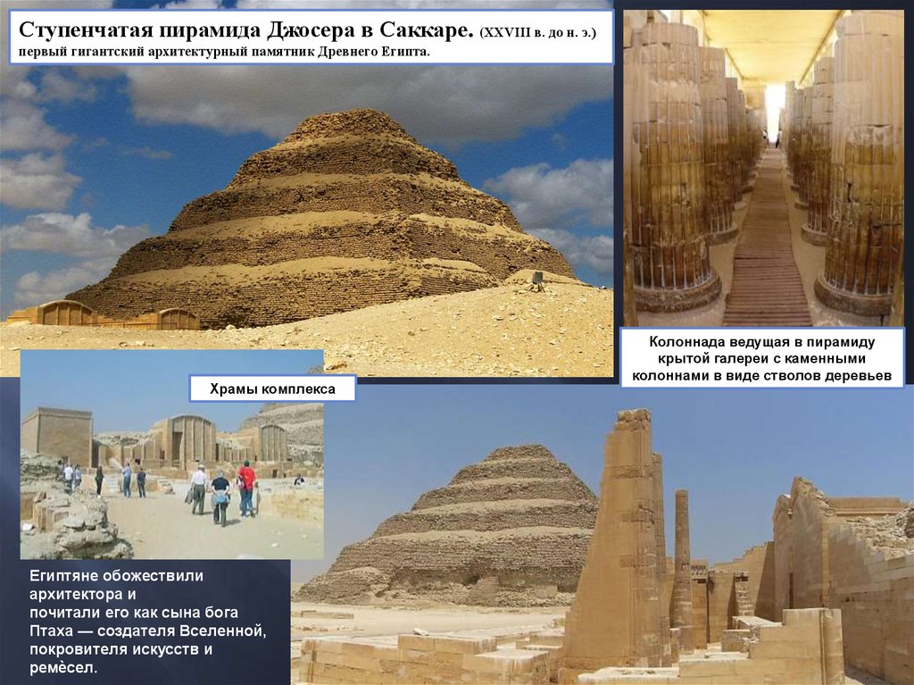 Ступенчатая пирамида Джосера в Саккаре. (XXVIII в. до н. э.)первый гигантский архитектурный памятник Древнего Египта.