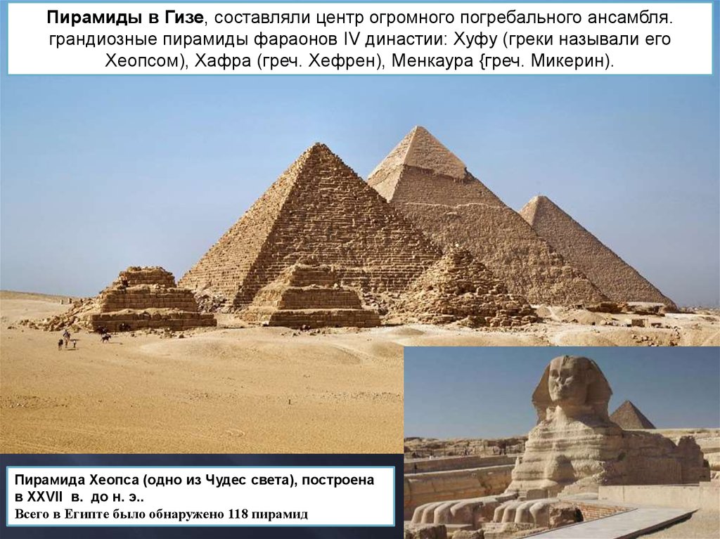 Пирамиды в Гизе, составляли центр огромного погребального ансамбля.грандиозные пирамиды фараонов IV династии: Хуфу (греки называли его