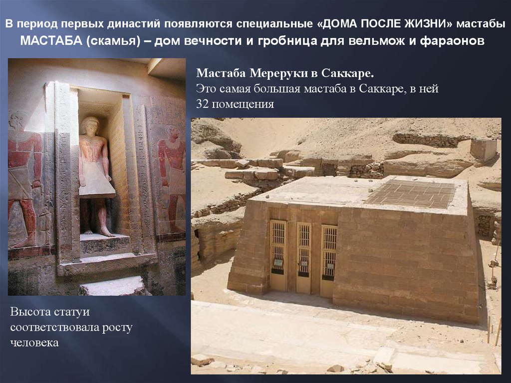 В период первых династий появляются специальные «ДОМА ПОСЛЕ ЖИЗНИ» мастабыМАСТАБА (скамья) – дом вечности и гробница для вельмож и фараонов