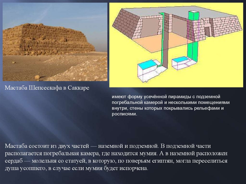 Мастаба состоит из двух частей — наземной и подземной. В подземной части