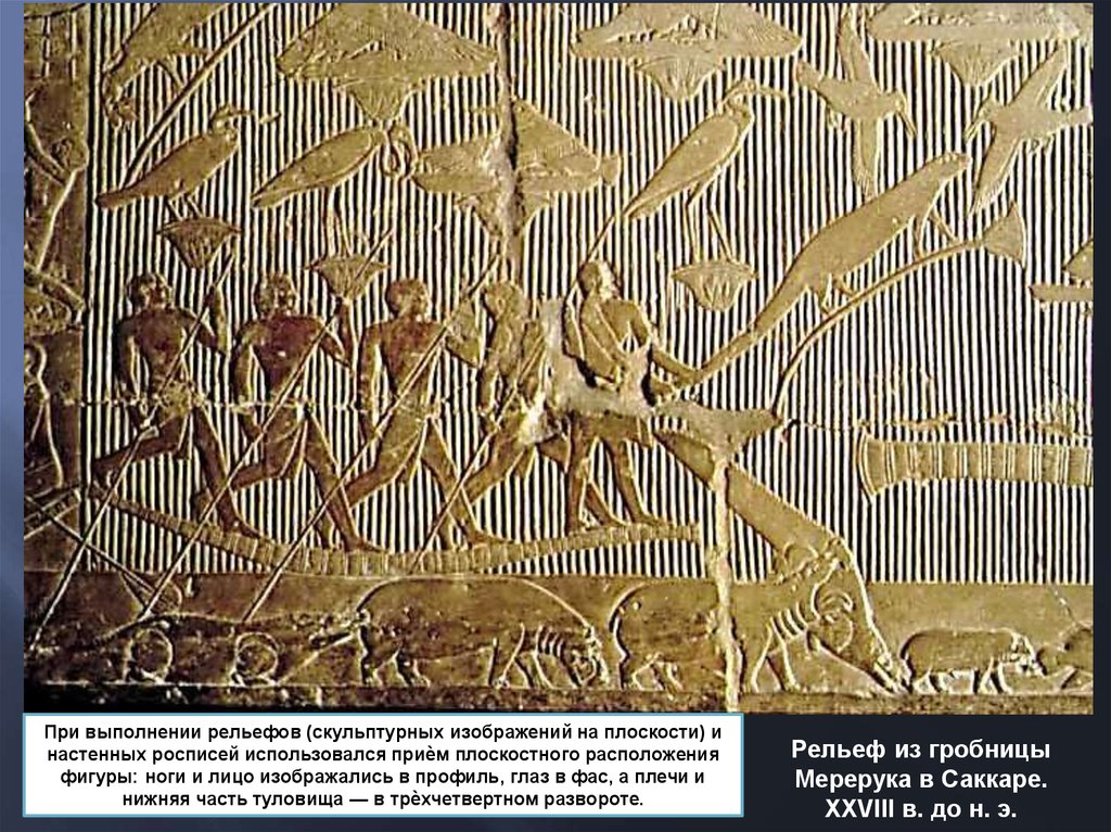 При выполнении рельефов (скульптурных изображений на плоскости) инастенных росписей использовался приѐм плоскостного расположения