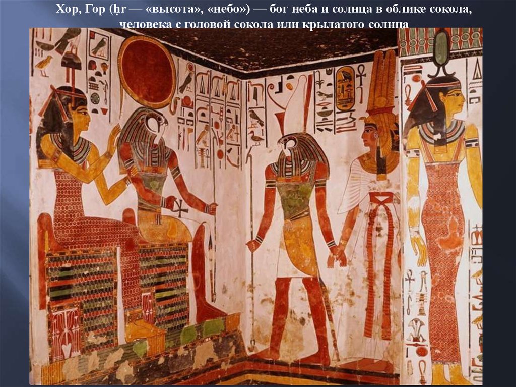 Хор, Гор (ḥr — «высота», «небо») — бог неба и солнца в облике сокола,человека с головой сокола или крылатого солнца