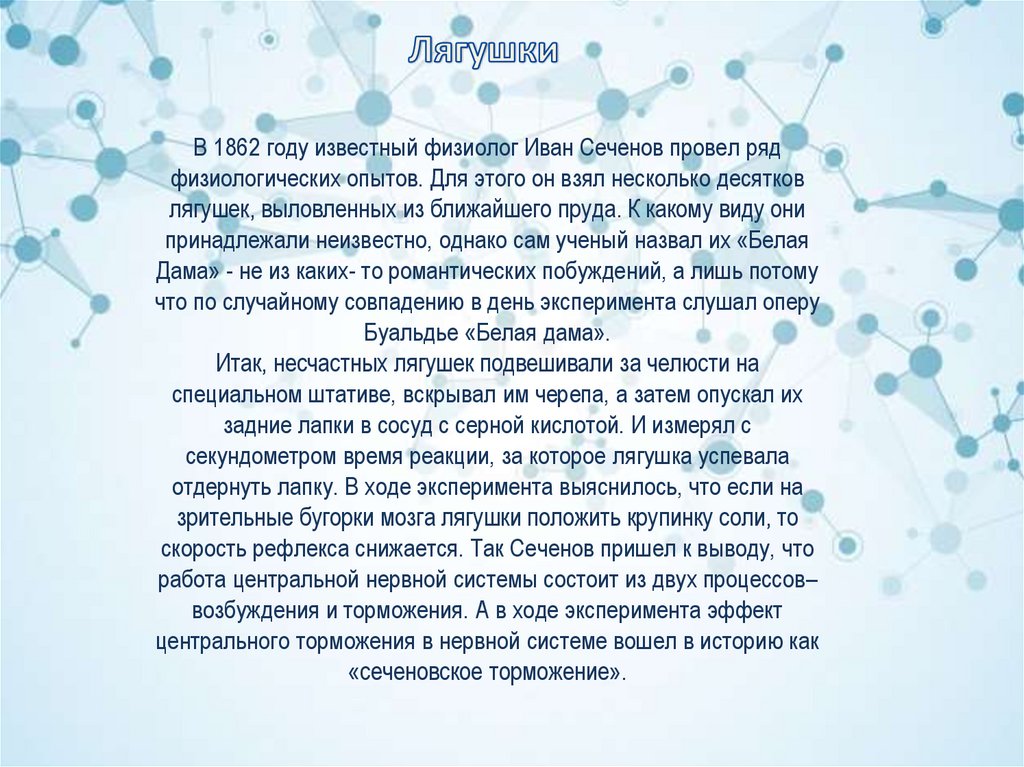 В 1862 году известный физиолог Иван Сеченов провел рядфизиологических опытов. Для этого он взял несколько десятков
