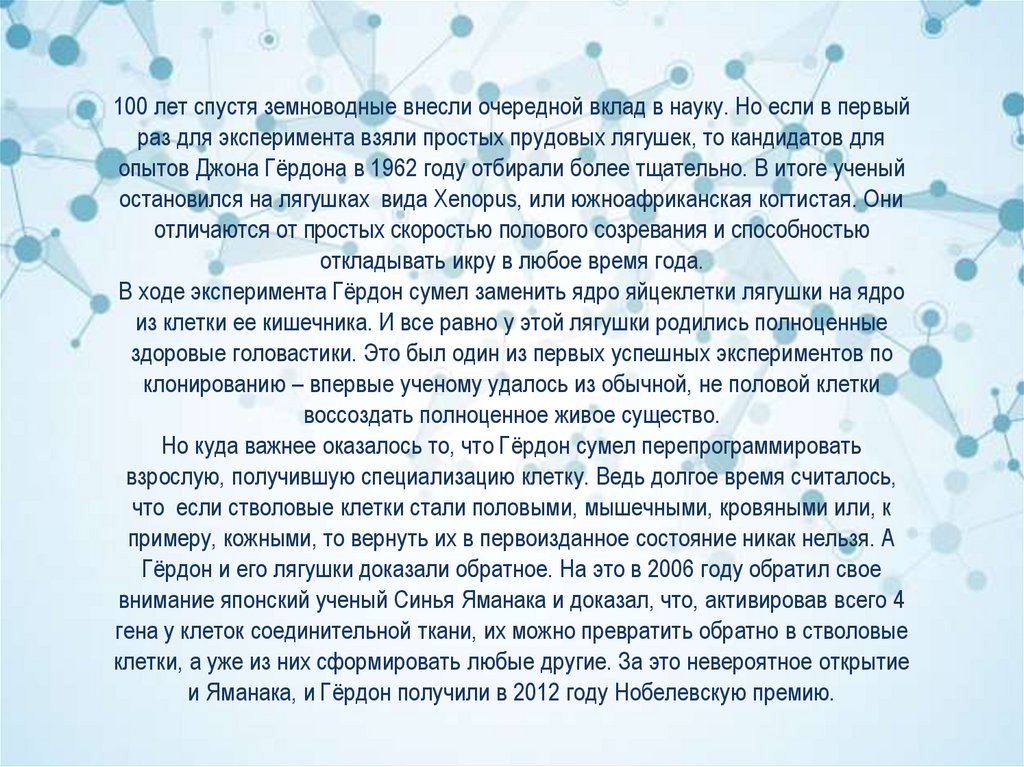 и Яманака, и Гёрдон получили в 2012 году Нобелевскую премию.