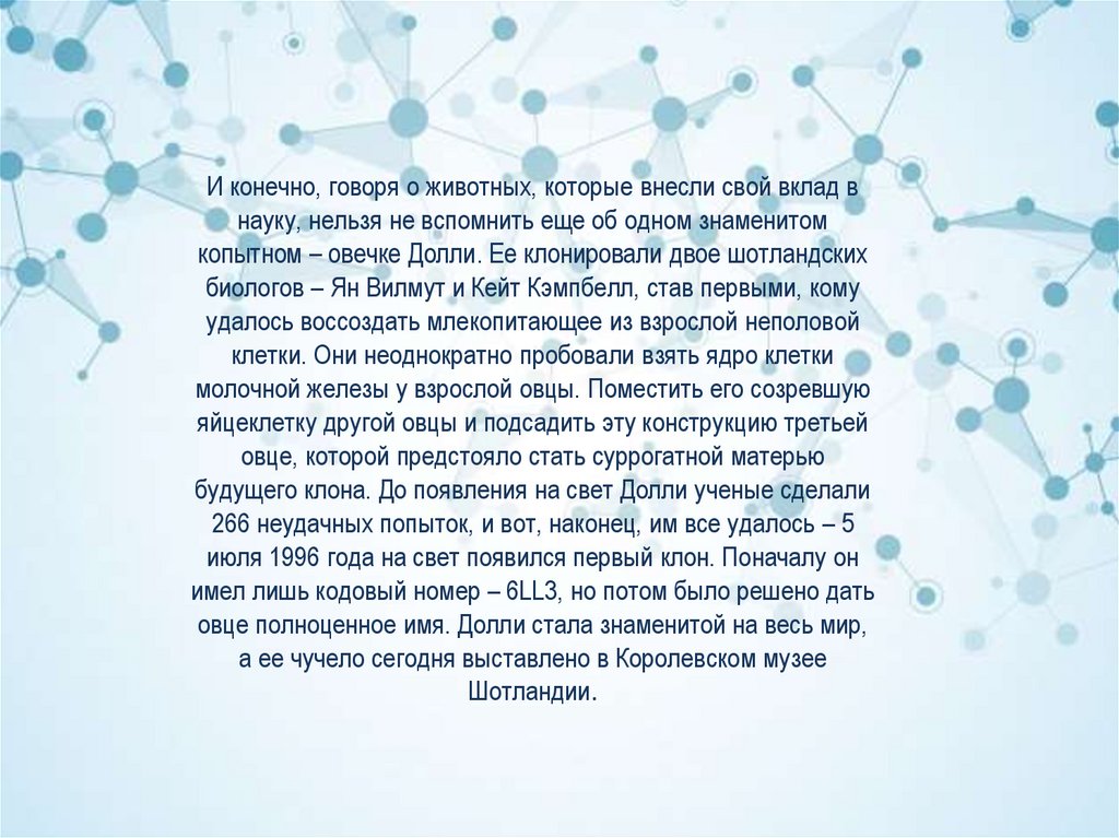 копытном – овечке Долли. Ее клонировали двое шотландских