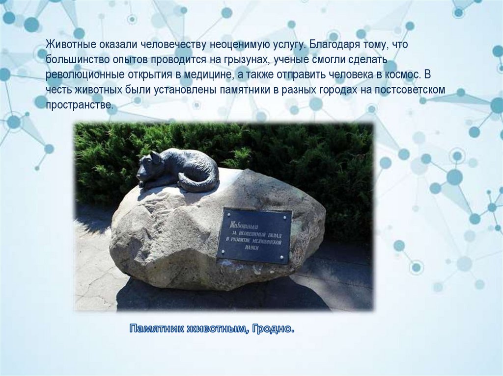 Животные оказали человечеству неоценимую услугу. Благодаря тому, чтобольшинство опытов проводится на грызунах, ученые смогли сделать
