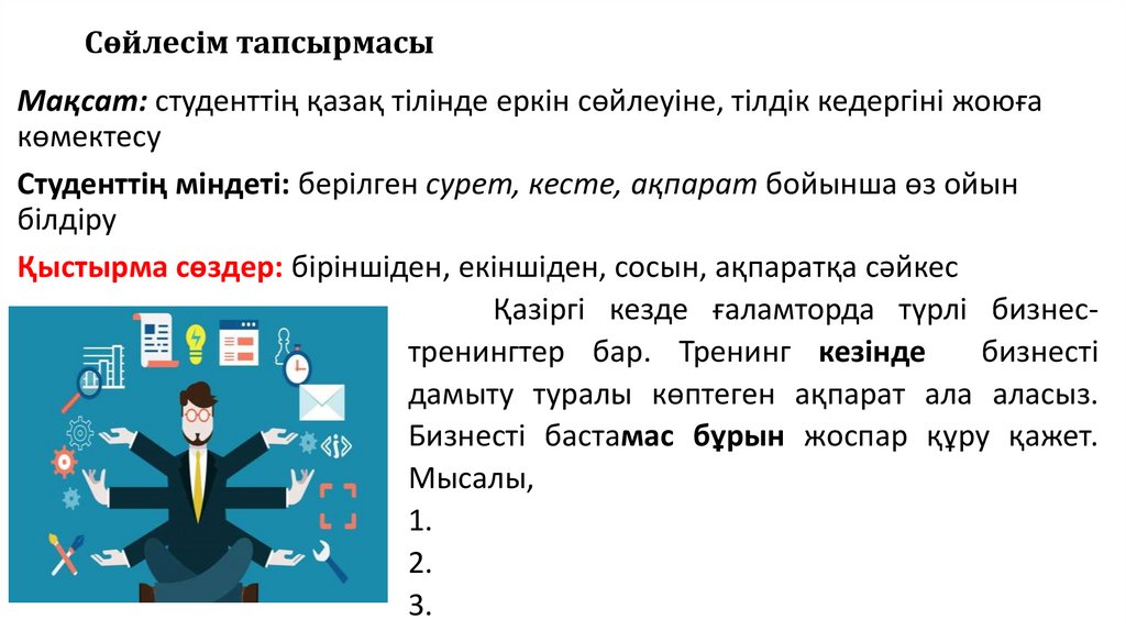 Сөйлесім тапсырмасыМақсат: студенттің қазақ тілінде еркін сөйлеуіне, тілдік кедергіні жоюға