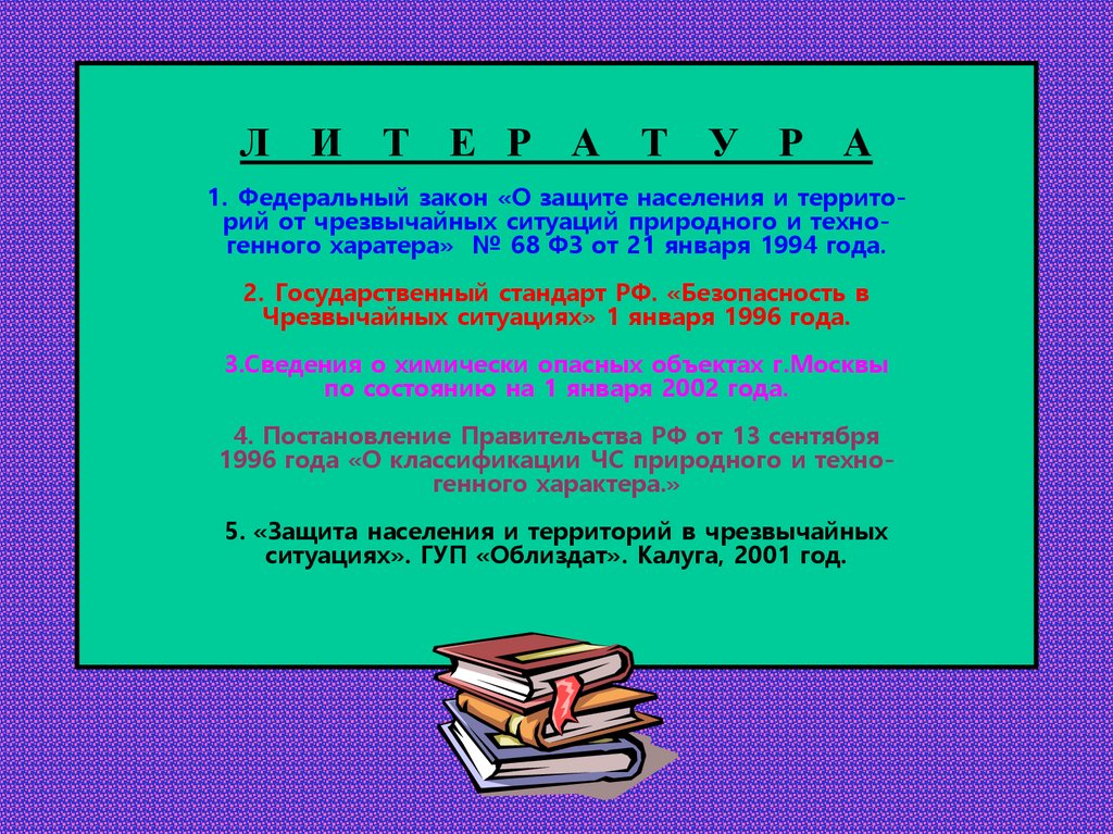 Л И Т Е Р А Т У Р А1. Федеральный закон «О защите населения и территорий от чрезвычайных ситуаций природного и техногенного харатера» № 68 ФЗ от 21 января 1994 года.