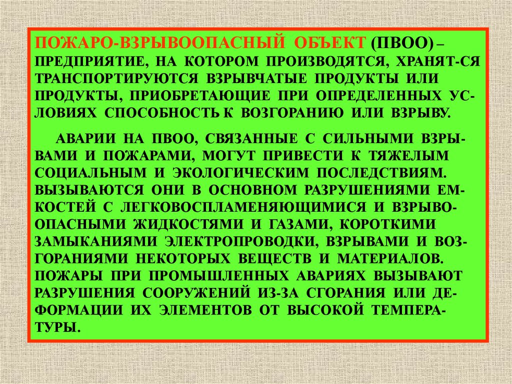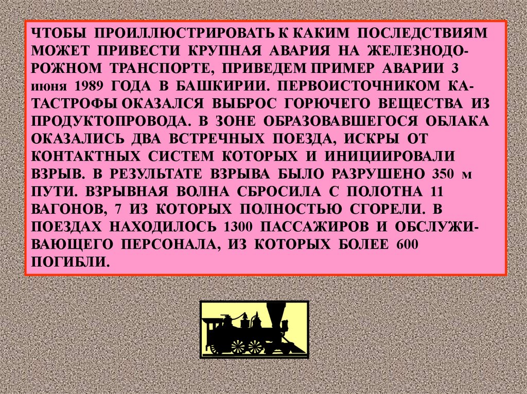 жизни и здоровью людей и приводящее к разрушению зданий, сооружений, оборудования и транспортных средств, нарушению производственного и транспортного процесса, а также к нанесению ущерба окружающей природной среде.