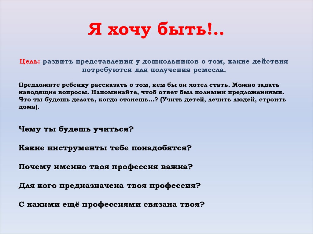 Я хочу быть!..Цель: развить представления у дошкольников о том, какие действия