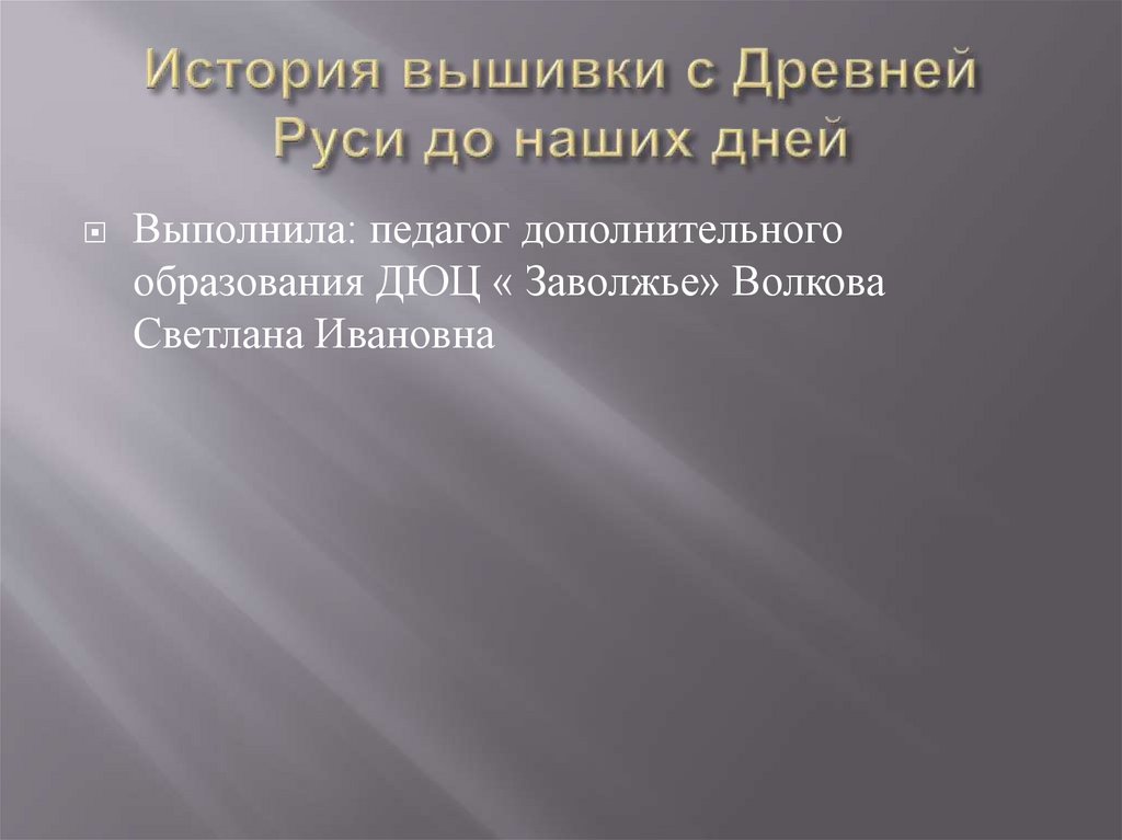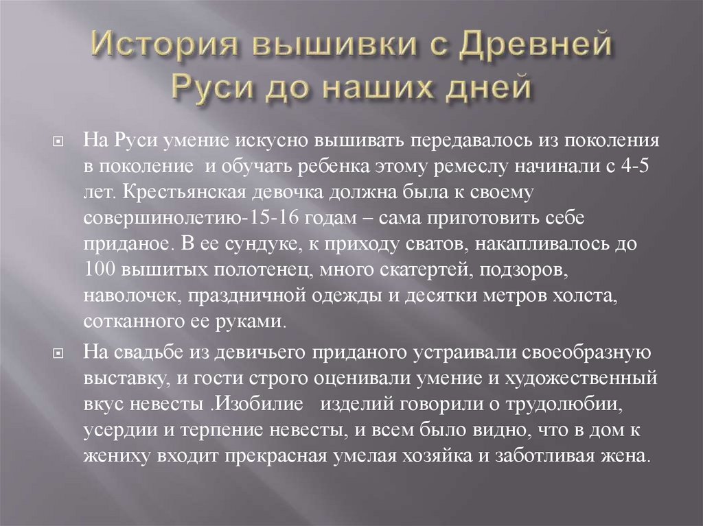 На Руси умение искусно вышивать передавалось из поколенияв поколение и обучать ребенка этому ремеслу начинали с 4-5