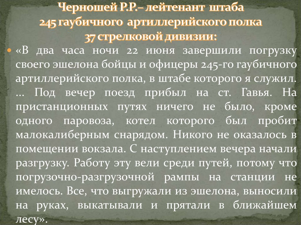 «В два часа ночи 22 июня завершили погрузкусвоего эшелона бойцы и офицеры 245-го гаубичного